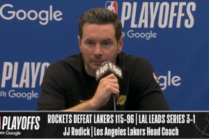 24直播网4月27日讯 NBA季后赛首轮G4,湖人96-115不敌火箭,系列赛大比分来到3-1。赛后JJ·雷迪克接受了媒体采访,以下为采访全文。