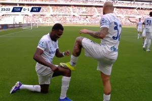 24直播网04月27日讯 意甲第34轮,国米客战都灵。23分钟,迪马尔科传球,图拉姆头球破门,国米1-0领先。
