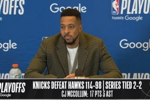 24直播网4月26日讯 NBA季后赛东部首轮G4,老鹰98-114不敌尼克斯,大比分2-2平。赛后麦科勒姆接受了采访,以下为采访全文。