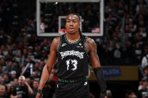 24直播网4月28日讯 NBA季后赛首轮G5,森林狼半场51-60落后掘金。