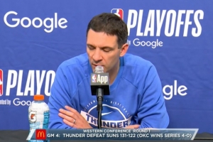 24直播网4月28日讯 NBA季后赛首轮G4,雷霆131-122胜太阳,大比分4-0晋级。赛后雷霆主帅戴格诺特接受了媒体采访,以下为完整版采访内容。