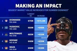 去年夏窗签约球员身价上涨榜:扬·迪奥曼德居首,武什科维奇次席