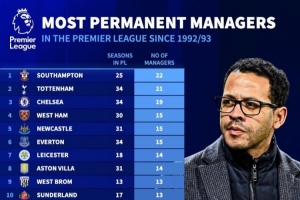 英超历史主帅人数排名:圣徒22人最多,热刺21人、切尔西19人